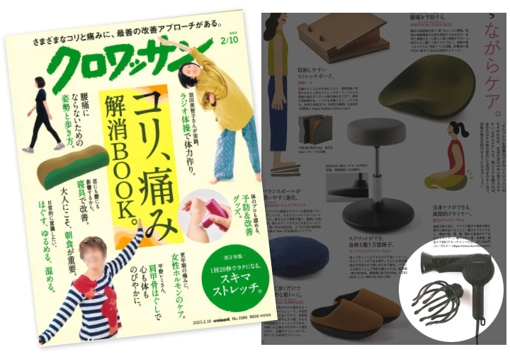 最新情報 2023年03月08日 メディア掲載 マガジンハウス雑誌 クロワッサン No.1086に『復元ドライヤーPro漆黒』が掲載されました。 「本当に効果をもたらすものはどれ?体のプロも認める予防&改善グッズ」特集内にて、全身ケアができる画期的ドライヤーとして復元ドライヤーⓇ Pro漆黒をご紹介いただきました。(51ページ) 前の記事 ニュース一覧 前の記事
