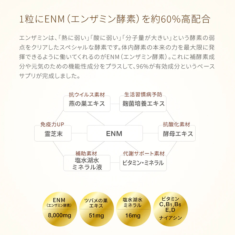 免疫力や自己治癒力を高めるために大切なのは、体内酵素の働きや新陳代謝の活性化。そのためにエンザミン(代謝調節サポート因子)を60%配合し、ほかにもさまざまな栄養素を加えました。各成分が互いの働きを高め合うことで相乗効果が生まれ、うれしい変化を実感できます。