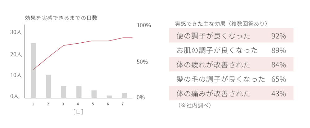 「インナーエステメルモ」を成人男女57人の方に10日間飲用していただいた後、効果実感できた日数や体調の変化など、効果についてアンケートを実施。その結果、全体の97%の方々が7日以内に効果を実感できたことがわかりました。「インナーエステメルモ」の即効性が証明されたといっても過言ではありません。
