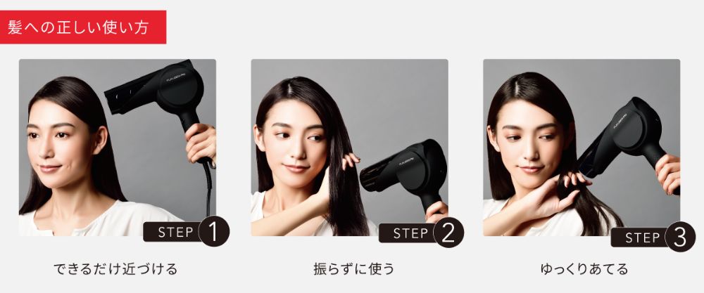 その革新的な技術を最大限に生かし、【徹底的に傷ませない】を実現するために、従来の《乾かすだけ》のドライヤーとは使い方が根本的に違います。